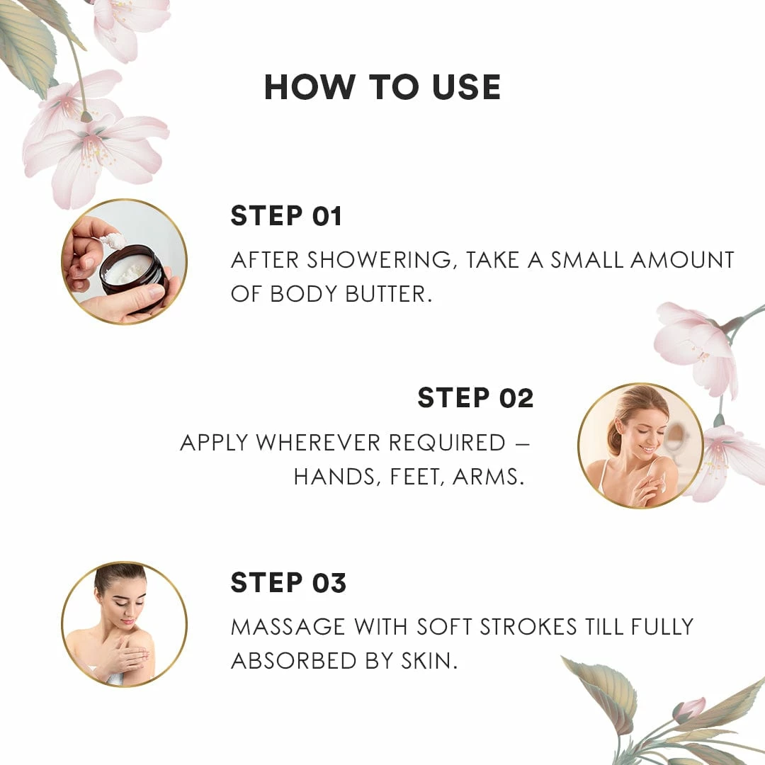 After showering, take a small amount of body butter. Apply wherever required – hands, feet, arms, legs, knees, elbows. Massage with soft, soothing strokes till fully absorbed by skin.
