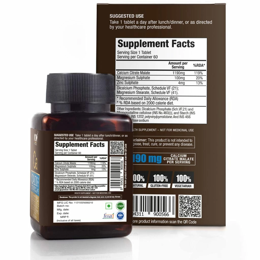 - Contains 1190 mg calcium citrate malate, 100 mg magnesium sulphate and 4 mg zinc sulphate.