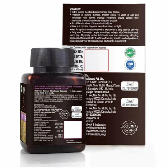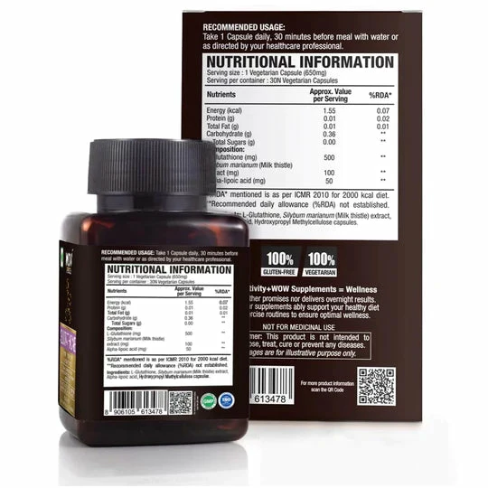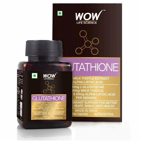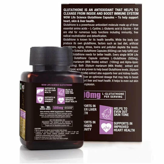 Glutathione capsules is a powerhouse antioxidant molecule made up of three essential amino acids โ L-Cysteine, L-Glutamic Acid and Glycine โ vital for numerous body functions including immunity, free radical neutralization and detoxification leading to improved immunity, clearer complexion and better liver health. Glutathione is an antioxidant produced in the cells of our body. 30 capsules per pack, every glutathione capsule contains 650 mg blend of L-Glutathione (500mg), Milk Thistle Extract (100 mg) and Alpha Lipoic Acid (50 mg). WOW Life Science Glutathione Capsules is natural, vegetarian, gluten-free and stearate-free.