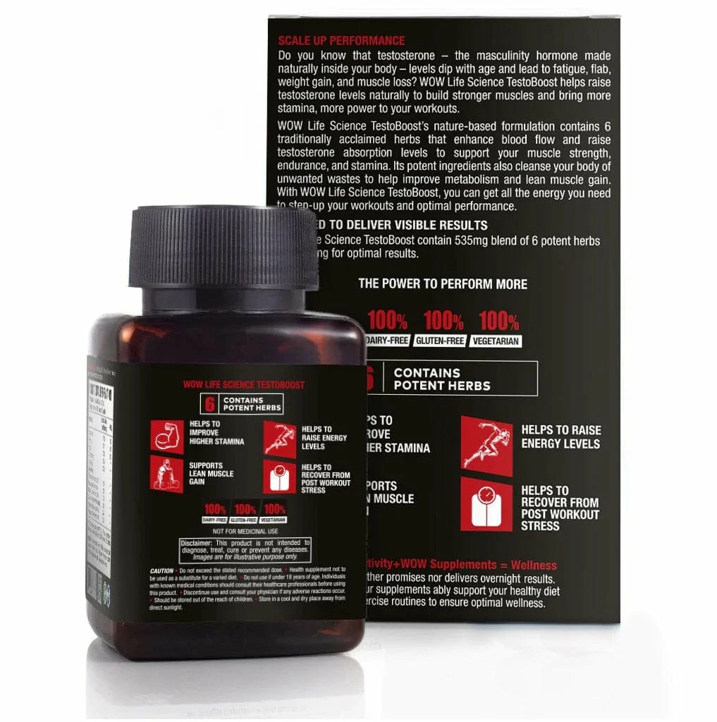 {“@context”:”https://schema.org”,”@type”:”FAQPage”,”mainEntity”:[{“@type”:”Question”,”name”:”WHAT IS TESTO BOOST CAPSULES & HOW WOULD THEY BENEFIT MY HEALTH?”,”acceptedanswer”:{“@type”:”Answer”,”text”:”Our testo boost capsules are an essential supplement for men and are known to improve heart health and blood circulation and energize the body.”}},{“@type”:”Question”,”name”:”WHY SHOULD I CONSUME TESTO BOOST CAPSULES?”,”acceptedanswer”:{“@type”:”Answer”,”text”:”Our testo boost capsules contain vitality-boosting herbs that help to accelerate metabolism, stimulate muscle growth and promote fat loss without side effects.”}},{“@type”:”Question”,”name”:”ARE THERE ANY SIDE EFFECTS THAT I SHOULD BE WORRIED ABOUT?”,”acceptedAnswer”:{“@type”:”Answer”,”text”:”If our testo boost capsules are taken holistically as per the specifications, there is hardly any possibility of a side effect. However, if you are taking any medications, consult your doctor before use.”}},{“@type”:”Question”,”name”:”CAN ANYONE TAKE WOW LIFE SCIENCE TESTO BOOST CAPSULES?”, “acceptedanswer”:{“@type”: “Answer”, “text”: “WOW Life Science Testo Boost Capsules is a carefully formulated dietary supplement, so yes, anyone can take this product. It is not for children. please consult a healthcare professional before use if you are on medications. Also, if you experience any severe reaction, discontinue use and immediately seek medical help. Please note that this product is for supporting your healthy diet and wellness regime. It does not promise to deliver overnight results and is not intended to diagnose, cure, treat or prevent any disease.”}},{“@type”:”Question”,”name”:”WHAT IS THE DOSAGE FOR WOW LIFE SCIENCE TESTO BOOST CAPSULES?”,”acceptedanswer”:{“@type”:”Answer”,”text”:”Take 1 capsule of our testo boost capsules in the morning and 1 in the evening at meal times with water, or as directed by a healthcare professional. Please cap the bottle tightly and store it in a cool dark place after opening to retain its efficacy.”}},{“@type”:”Question”,”name”:”IS WOW LIFE SCIENCE TESTO BOOST CAPSULES 100% VEGETARIAN?”,”acceptedAnswer”:{“@type”:”Answer”,”text”:”Yes, Our testo boost capsules are 100% natural, vegetarian & gluten-free.”}},{“@type”:”Question”,”name”:”IS TESTO BOOST CAPSULES HELP IN MUSCLE GROWTH?”,”acceptedAnswer”:{“@type”:”Answer”,”text”:”Our testo boost capsules help in raising the testosterone levels which naturally build stronger muscles and increase stamina levels and give more power in the workouts.”}},{“@type”:”Question”,”name”:”IS TESTO BOOST CAPSULES GOOD FOR THE HEART?”,”acceptedAnswer”:{“@type”:”Answer”,”text”:”Our testo boost capsules contain natural ingredients which are known to improve heart health and blood circulation and energize the body.”}},{“@type”:”Question”,”name”:”IS TESTO BOOST CAPSULES REDUCE EXCESSIVE BODY FAT?”,”acceptedAnswer”:{“@type”:”Answer”,”text”:”Our testo boost capsules are made with clinically proven herbal ingredients which boost metabolism and burn excess body fat.”}}]}