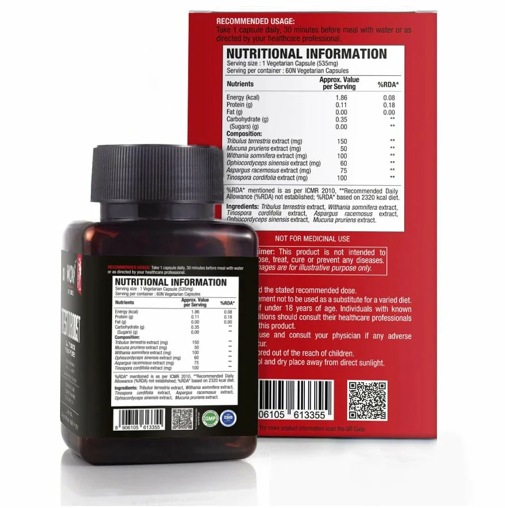Our testo boost capsules are formulated for heart health, blood circulation, and energizing the body. It is a testosterone booster essential supplement for men. It has a potent blend of 6 traditionally acclaimed herbs including Tribulus Terrestris, Mucuna Pruriens, Withania Somnifera, Cordyceps Sinensis, Shatavari, and Tinosporia Cordifolia. Each capsule contains 550mg of the potent herbal blend. Our testo boost capsules are totally free of binders, fillers, or additives.