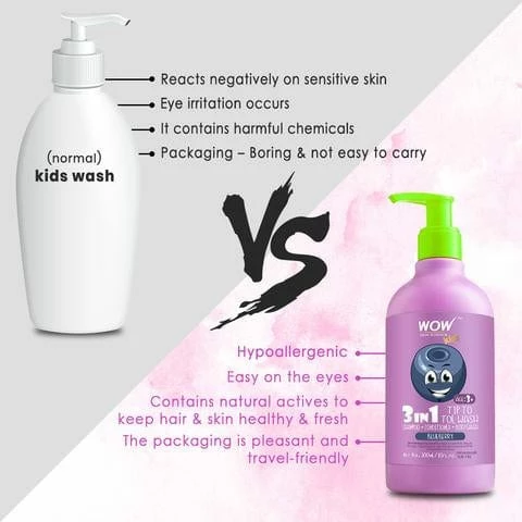 Kids 3-in-1 Blueberry Tip to Toe Wash is an all-in-one Shampoo + Conditioner + Body Wash for kids (age 3+). An amazing and totally delightful product that works as a shampoo, a conditioner and a body wash too. It formulated especially for kids, its bewitching blueberry fragrance combined with ultra-moisturizing rich, foaming lather makes your kids enjoy their bath hour without tantrums. As a bonus, it also leaves your child’s skin and hair super clean, super soft and sweet-smelling too. WOW Skin Science 3-in-1 blueberry kids shampoo + conditioner + body wash is dermatologist-approved formula is also tear-free, easy on the eyes, hypoallergenic, skin-friendly, and free of harsh chemicals like sulphate, parabens, mineral oil, PEG or silicones.