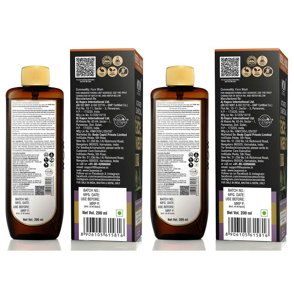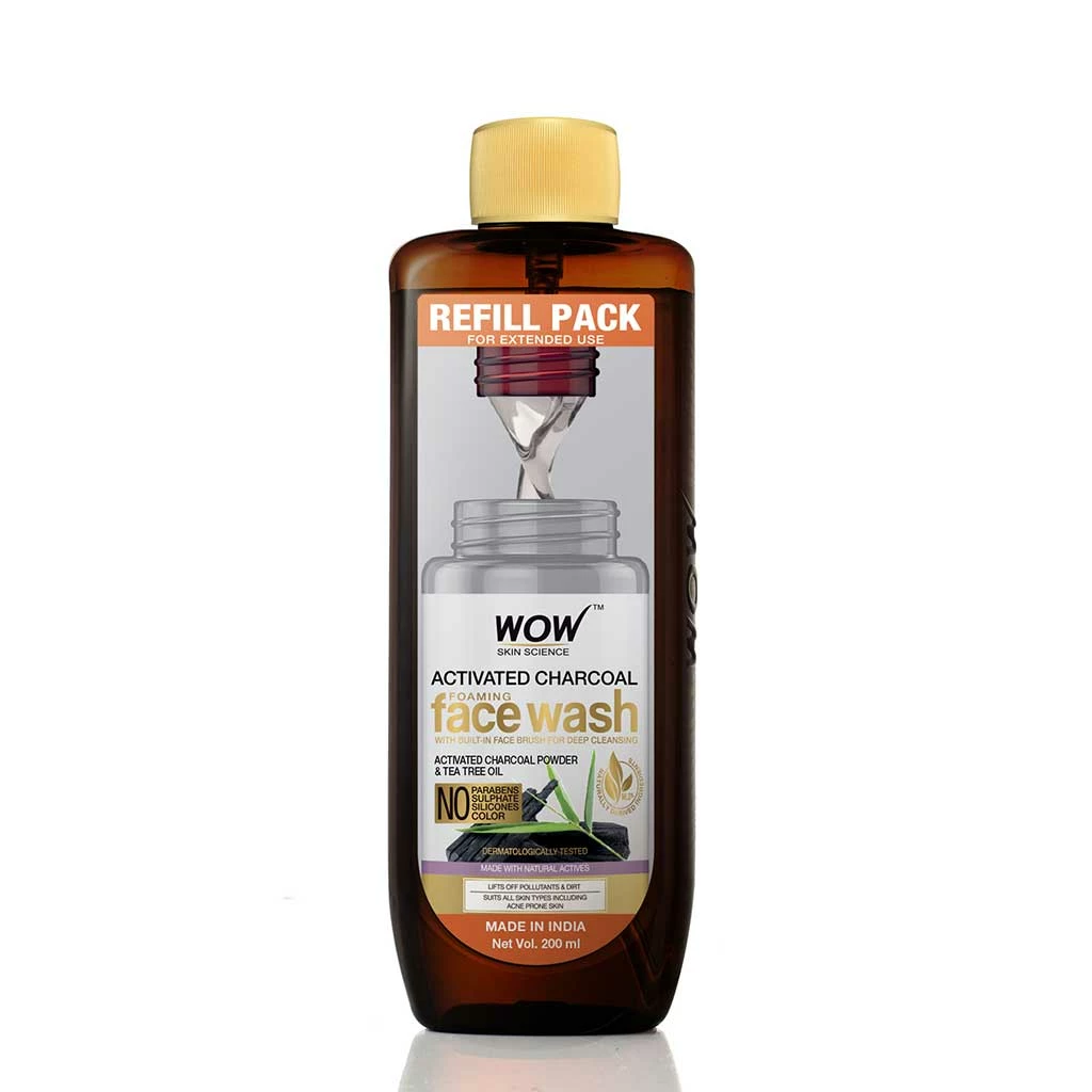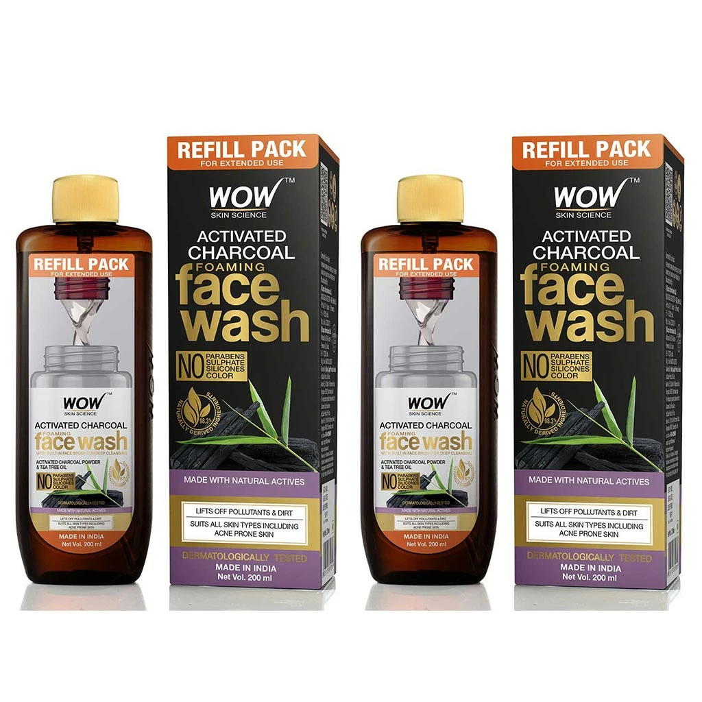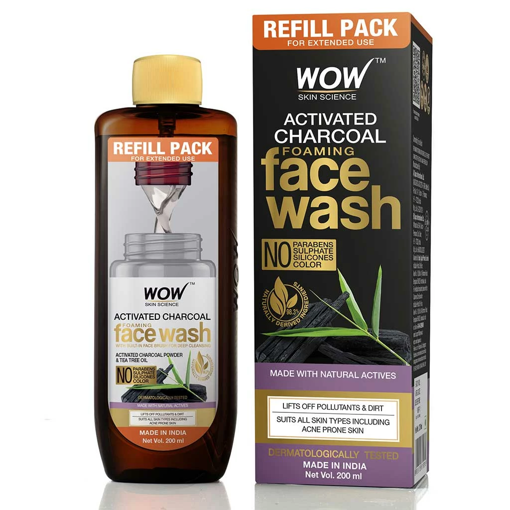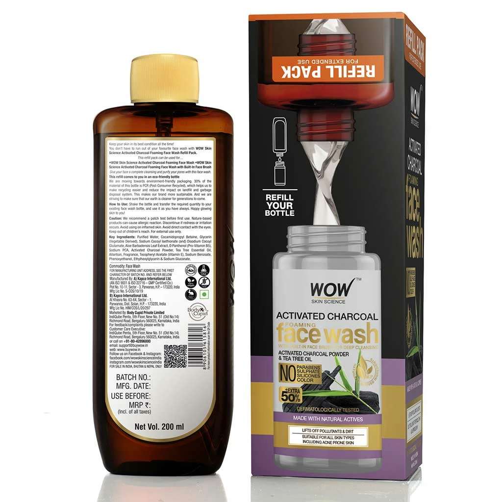 Never worry about running out of your favourite WOW Skin Science Activated Charcoal Foaming Face Wash with the Refill Pack. Extend your skin care routine and fill up your existing foaming face wash bottle from this pack. This lets you have great skin while being more responsible towards planet earth. You are able to reduce your carbon footprint because 30% of the material of this bottle is PCR (Post-Consumer Recycled), which helps us to make recycling easier and reduce the impact on landfill and garbage disposal system. Now you can continue to get rid of pollutants on skin and revive your dull, aging skin with the Activated Charcoal Foaming Face Wash. A brightening and clarifying face wash that draws out dirt from your skin and clear out grime from the pores. Its natural actives gently wash away skin impurities giving your skin a chance to repair itself and restore natural radiance. It helps to balance excess oil production on skin and gives it a dewy matte appearance. It helps to give your tired, dull complexion a radiance boost. Use the face wash twice a day to keep your skin clear of dirt and pollution. This foaming face wash not only cleanses skin but also helps to maintain skin hydration levels.