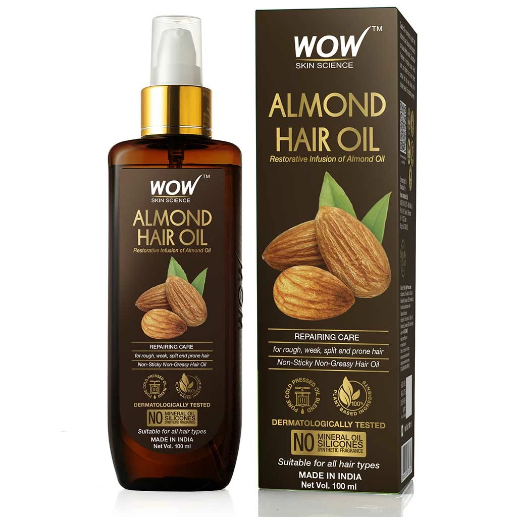 Almond hair oil is care for your breakage-prone, damaged hair, dry roots and sensitive scalp with a relaxing head massage. It is a nourishing and repairing hair oil that moisturises scalps and helps to make frizzy, rough hair more manageable. It delivers the hair-nourishing goodness of almond oil, lemon essential oil and a blend of pure, cold-pressed oils. These potent actives help to nourish weak roots, condition dry, itchy scalp, strengthen strands, minimise split ends, soften rough hair and add lustre. WOW Skin Science Almond hair oil is a lightweight, non-sticky oil that gets easily absorbed into the scalp. Massage your scalp and hair twice or thrice a week before shampoo to repair your hair. Ideal for those with dry, dull hair with split ends.