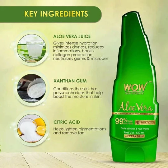 Aloe vera gel is a cleansing conditioner for strong, shiny, and dandruff-free hair, it is great for use as a hair gel or leave-in conditioner for shinier, healthier hair. It is also a hair & scalp nourisher, just start massaging liberally on the scalp. Leave overnight. Shampoo the next morning. Our aloe vera gel gives intense hydration, minimizes dryness, keeps the pores tight to reduce acne & soothes inflammations, boosts collagen production, and neutralizes germs & microbes. It inhibits microbes and germs and moisturizes the skin, boosts immunity, and aids in faster healing of wounds. It helps lighten pigmentations and remove tan. It helps soften the hair, reduce dryness, check dandruff & itchy scalp & heal bacterial & fungal infections. As an aftershave, it works great. WOW Aloe Vera Gel is 99% pure extracted from ripe, robust & succulent Aloe Vera leaves. Regular use of our aloe vera gel for face is highly recommended to get the best results.