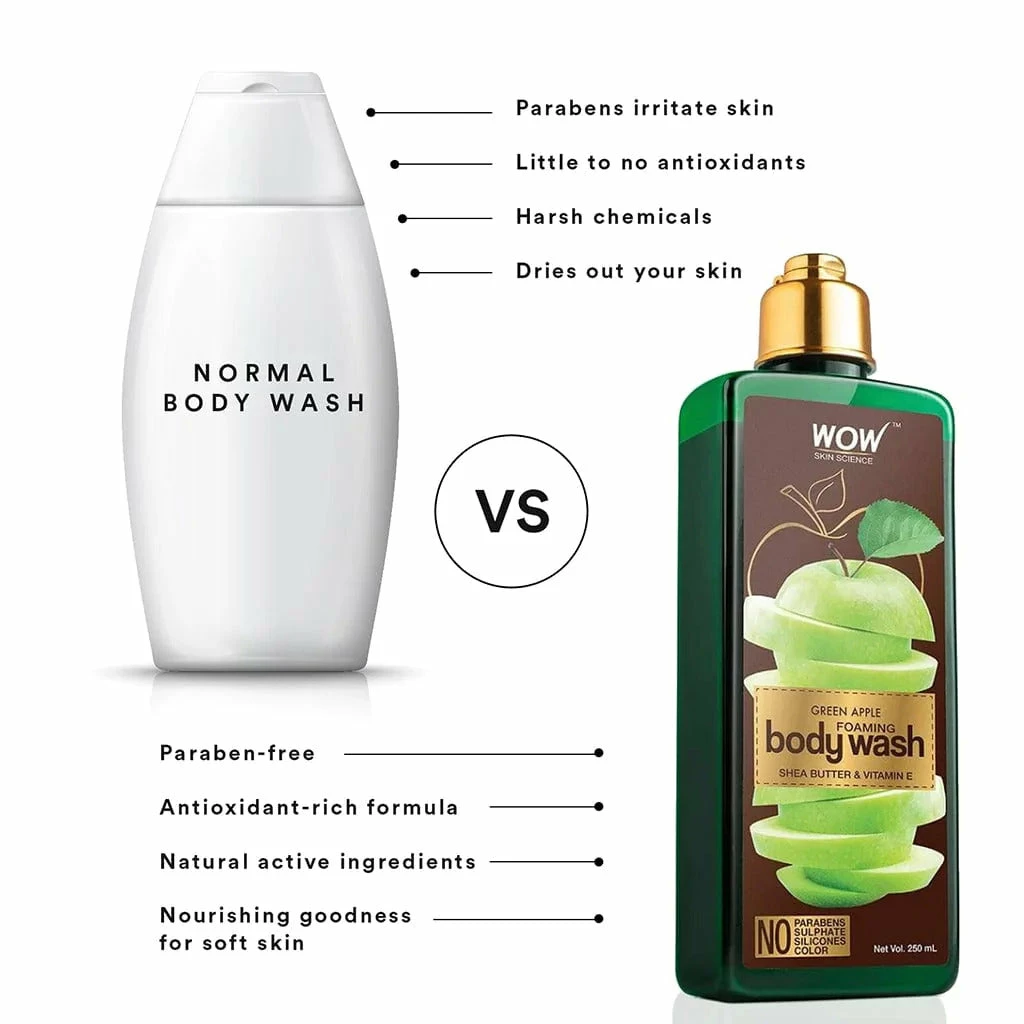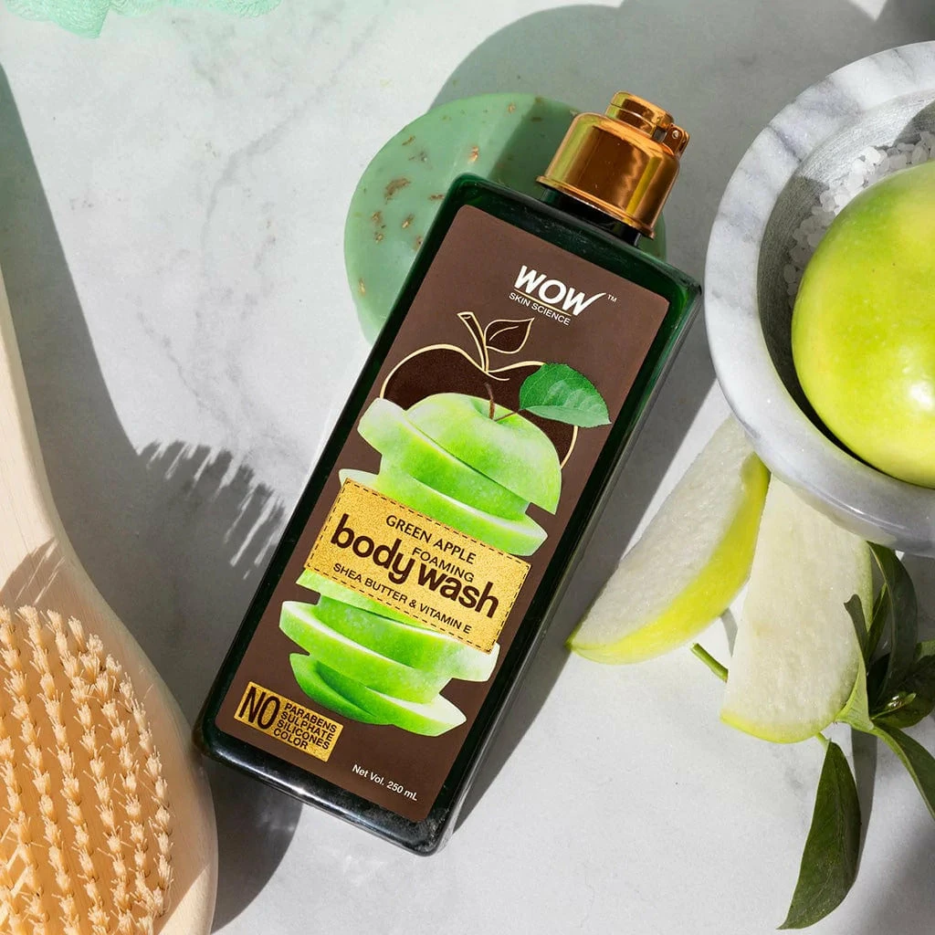 Green apple body wash helps to keep your skin free from illness and results in hydrated, nourished, smoother, and younger skin. Its rich and sudsy lather indulges your skin leaving it feeling clean, smooth, and silken. It helps to give your skin healing care and ample nourishment and brings a glow to the skin. It not just helps to cleanse your body but also gets you healthy, toxin-free bathing too. It is the loveliest way to add pure and crisp joy to your morning and evening bathing times. WOW Skin Science Green Apple Foaming Body Wash is 100% vegan gluten-free, cruelty-free, and dermatologically tested.