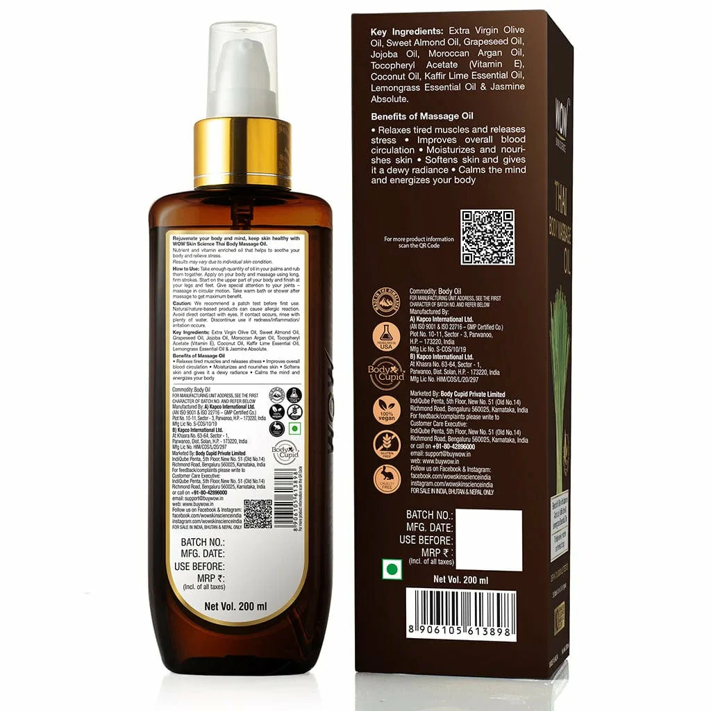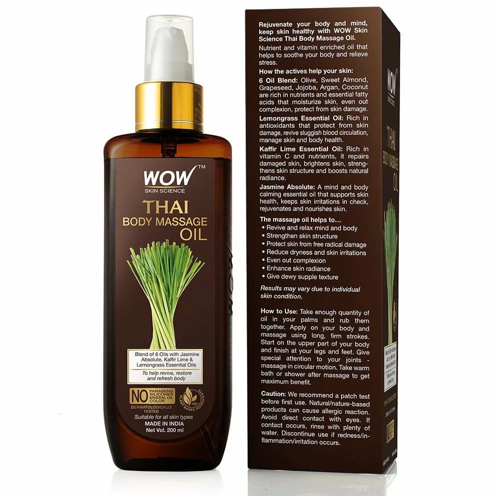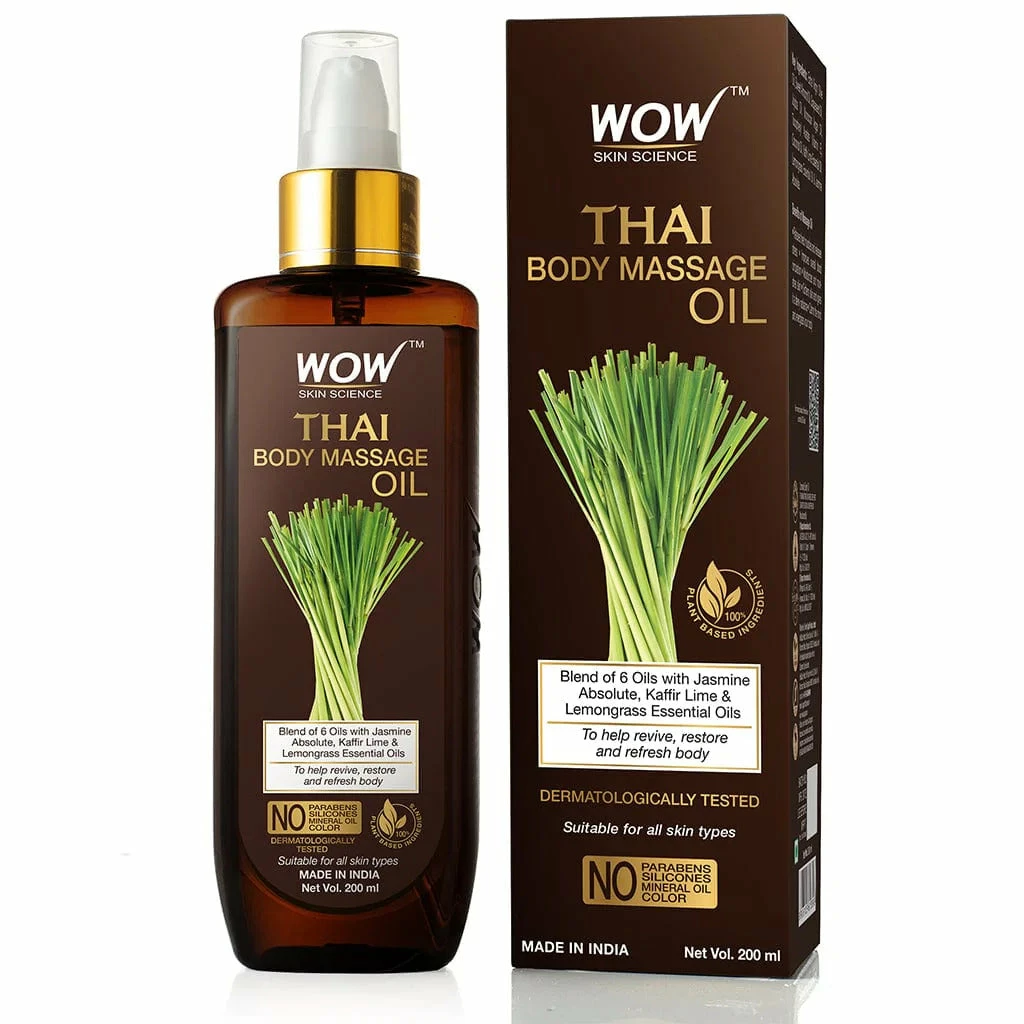 WOW Skin Science Thai Body Massage Oil is made from natural actives, it is 100% vegan, gluten-free, and contains no mineral oil, parabens, silicones, or color.