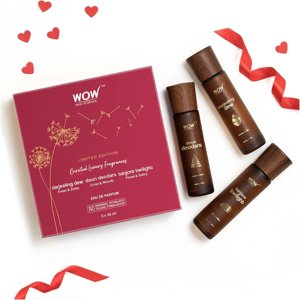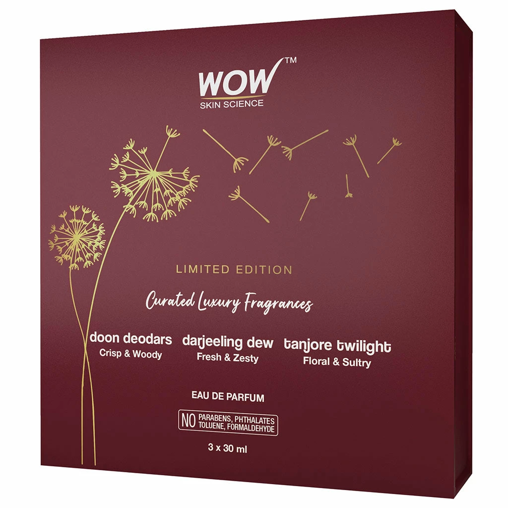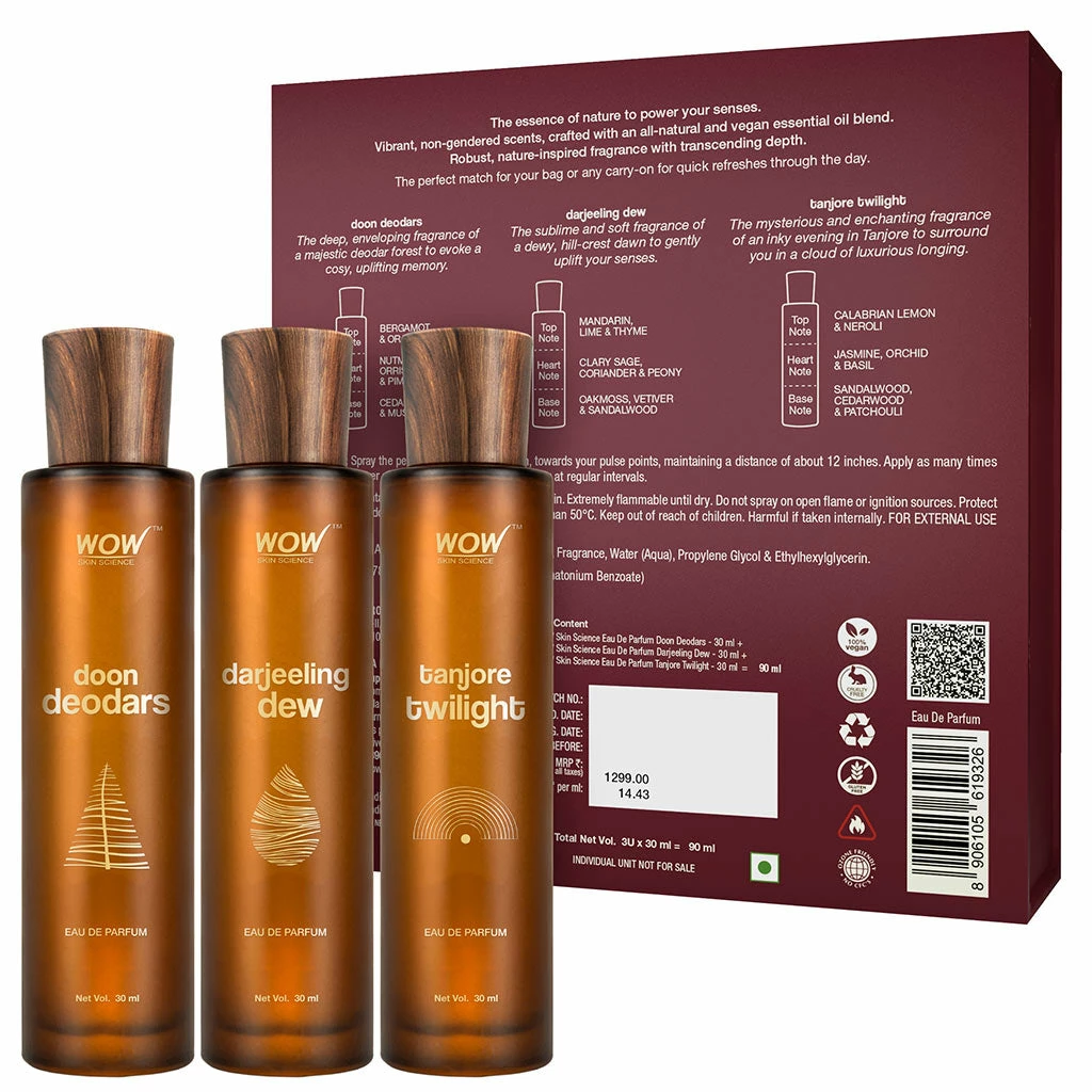 Darjeeling Dew: Fresh and Zesty All-Day Perfume Our WOW Skin Science Eau De Parfum Darjeeling Dew belongs to a moment in nature. It is a sublime fragrance, full of fresh notes, that evoke memories of the dew-drenched dawn in the mountains of Darjeeling. This full-bodied unisex perfume has a zesty and fresh bouquet that makes a lasting impression – transporting you to a memory of lush natural surroundings. It is inspired by the crisp scents that remind you of the freshness of the mountains and mornings at high altitudes. The fragrance begins with the citrusy notes of mandarin, lime, and thyme that slowly transition into herbaceous heart notes of clary sage, coriander, and peony, then finally settling into the warm, woody notes of oakmoss, vetiver, and sandalwood.