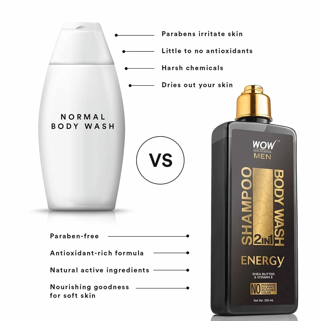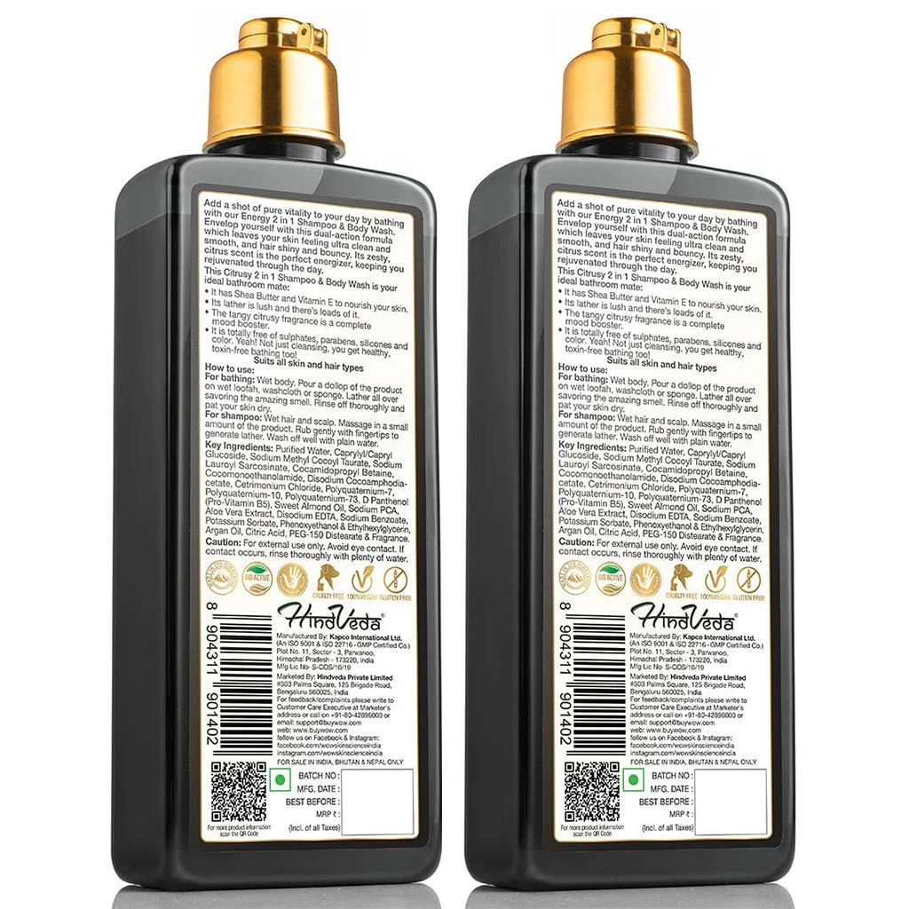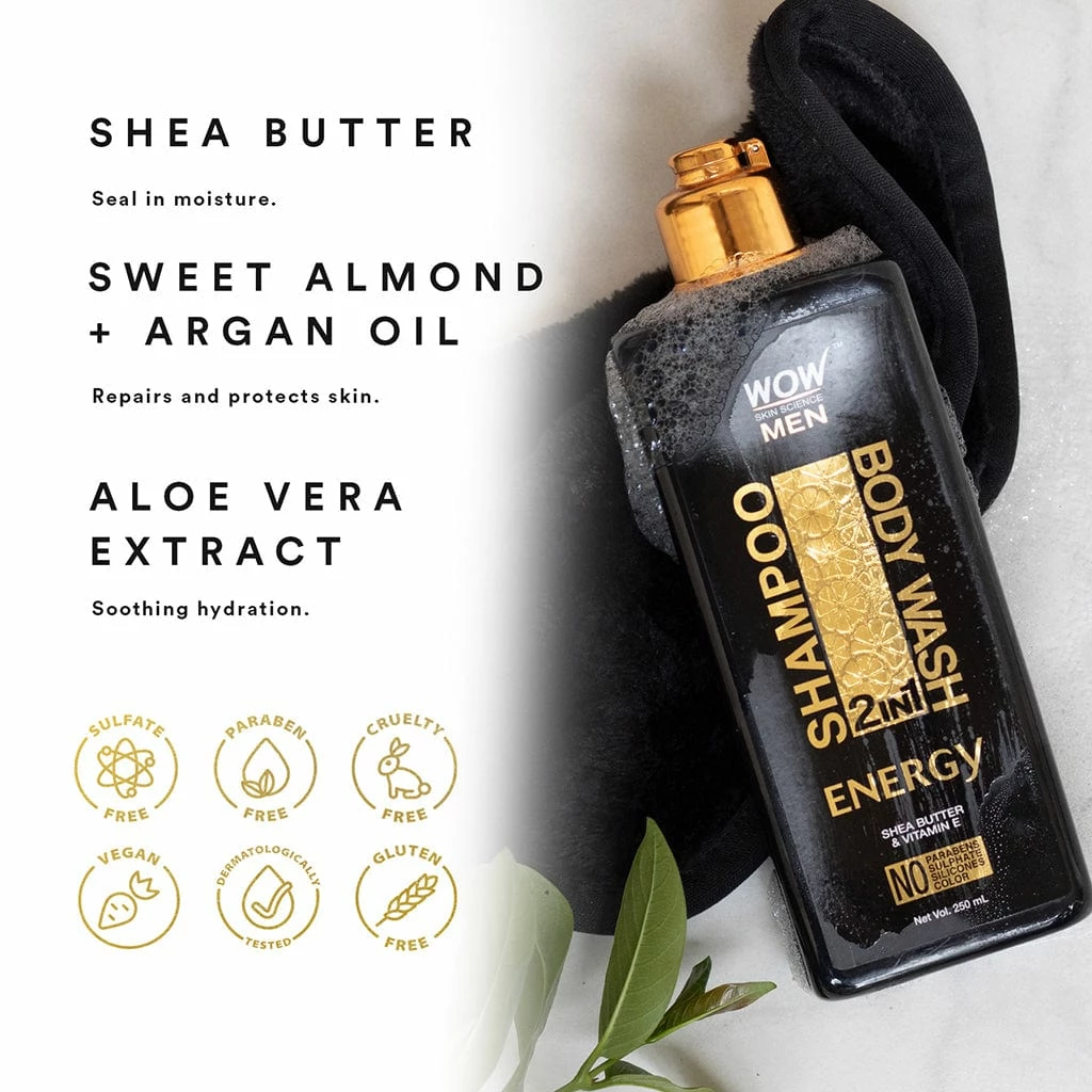 WOW Skin Science Energy 2 In 1 Shampoo and Body Wash gives you a shot of vitality every time you bathe with it. Its awesome tangy and citrusy fragrance smells sensational. And all that luscious lather feels like pure bliss. Sweet Almond and Argan Oils and Pro Vitamin B5 in the formulation give your skin, scalp, and hair gentle cleansing and moisturizing care.