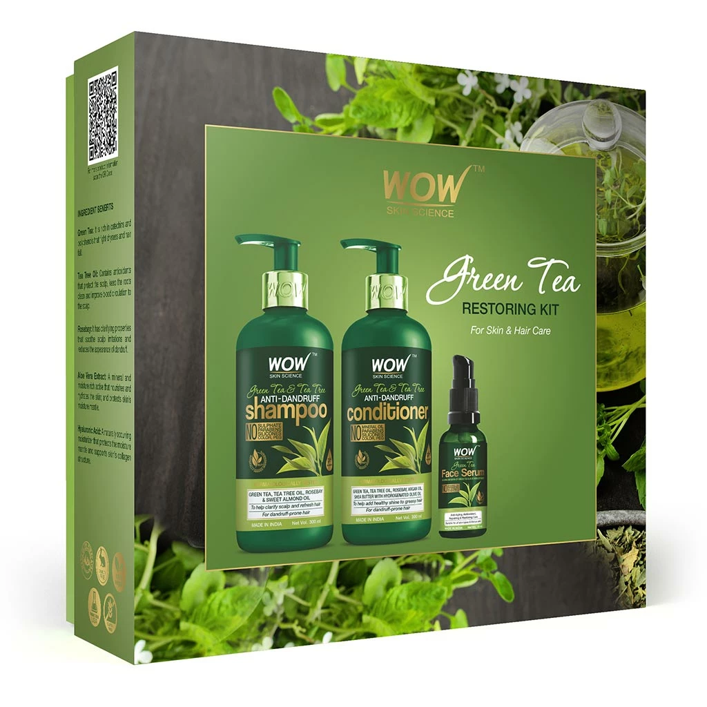 Why this kit is worth picking up? This specially curated, easy-to-use kit has products that be used to rejuvenate dry, aging skin and refresh dandruff-prone hair. WOW Skin Science Green Tea & Tea Tree Anti-Dandruff Shampoo is a clarifying and invigorating hair cleanser that clears away dry flakes and protects weak hair. WOW Skin Science Green Tea & Tea Tree Anti-Dandruff Conditioner is smoothening and shine-restoring hair conditioner to keep greasy, dandruff-prone hair soft and fresh. WOW Skin Science Green Tea Face Serum is a skin reviving and restoring serum to support your anti-aging care ritual.