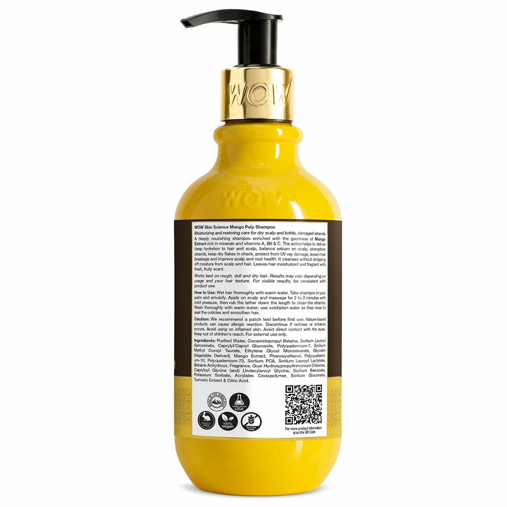 Restore your dry scalp and brittle, damaged strands with the moisturizing goodness of WOW Skin Science Mango Pulp Shampoo. It is a moisturizing and restoring shampoo that balances sebum on scalp keeps hair moisturized. It helps to add softness to rough strands and improve hair elasticity and strength. Your hair looks healthy and luxuriant. A deeply nourishing shampoo that cleanses your scalp and hair, helps to remove build-up without stripping off moisture barrier. It gently cleanses your scalp and hair which helps to remove dirt, grime, and buildup leaving your hair clean and fragrant. The vitamins enriched mango extract helps to keep dry flakes in check, protect from UV ray damage, lessen hair breakage and improve scalp and root health. It cleanses without stripping off moisture from scalp and hair. For visible results, be consistent with product use. Results may vary depending on usage and your hair texture.
