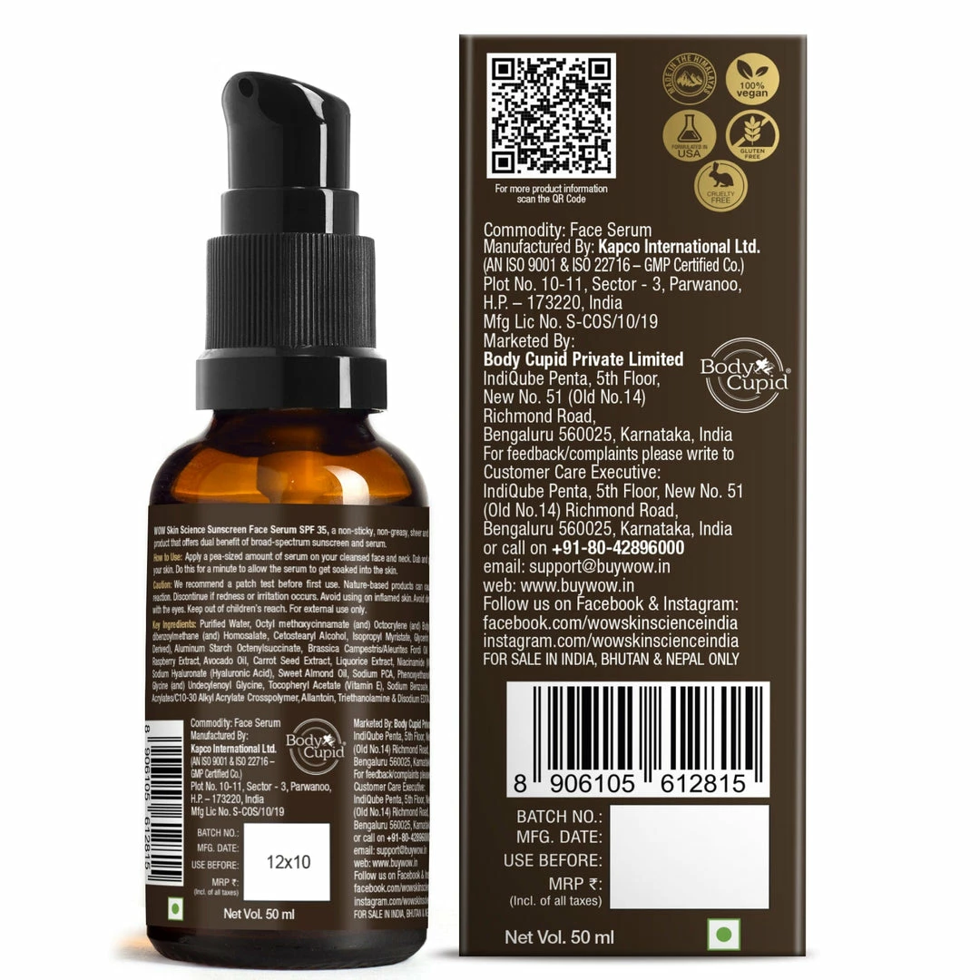 WOW Skin Science Sunscreen Face Serum SPF 35 combines benefits of sunscreen and serum. Its non-greasy, non-chalky, non-patchy and lightweight formulation gives daily broad spectrum protection from harmful UVA and UVB sun rays from your everyday sun exposure. It also gives brightening, smoothing and rejuvenating benefits that a face serum provides. It has been infused with naturally sun blocking extracts of raspberry and carrot seed, along with avocado oil. Apply it right after cleansing, toning and moisturizing. No need to re-apply sunscreen when out in sunlight hours. Smooth matte finish – no streaks or trickles on sweating. Especially suitable if you have to be out in intense sun. WOW Skin Science Sunscreen Face Serum SPF 35 is a non-greasy, non-chalky, non-patchy and lightweight formulation suitable for daily sun exposures. Delivers twin benefits – everyday broad spectrum UVA/UVB sun protection plus advanced anti-aging serum. Also brightens, smoothens and rejuvenates skin. No more buying separate serum and sunscreen. Smooth matte finish minus streaks or trickles on sweating. No more repeat sunscreen applications when out in sunlight on daily basis.