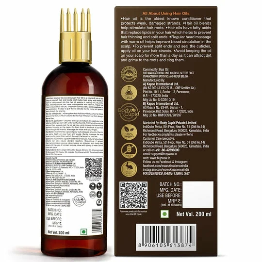 Our argan hair oil is a premium non-sticky hair oil blend formulated to revive thin, dry, brittle, undernourished, split-ended, frizzy, and unmanageable hair. It contains genuine and finest quality Moroccan Argan Oil along with Extra Virgin Olive Oil, Sweet Almond Oil, Grapeseed Oil, Castor Oil, Jojoba Oil, and Coconut Oil. Our moroccan argan oil deeply heals, Smooth, and restores luster to damaged dry, and coarse hair. It is made with 100% pure cold-pressed oils, 100% free of mineral oil and silicone for holistic hair care.
