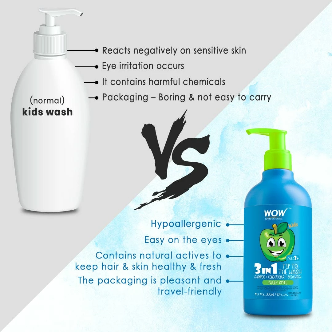 WOW Skin Science Kids 3-in-1 Green Apple Tip to Toe Wash is an all-in-one Shampoo, Conditioner & Body Wash for kids (age 3+). Yes, it is a single, kids’ specialist product that you can use three ways! Its awesome apple fragrance is so amazingly refreshing that not only does bathing a fun hour for your child, it also makes the child feel happy and peppy. Its ultra-moisturizing rich, foaming lather leaves your child’s skin and hair so very clean, soft and sweet smelling too.