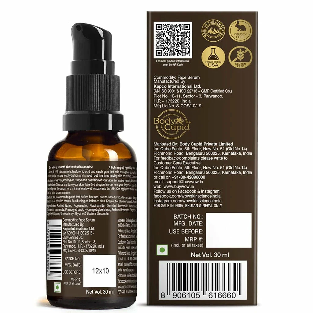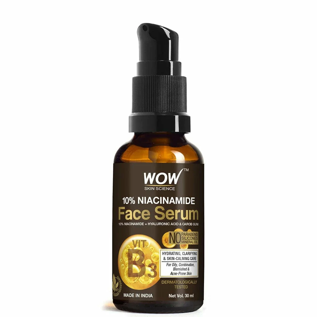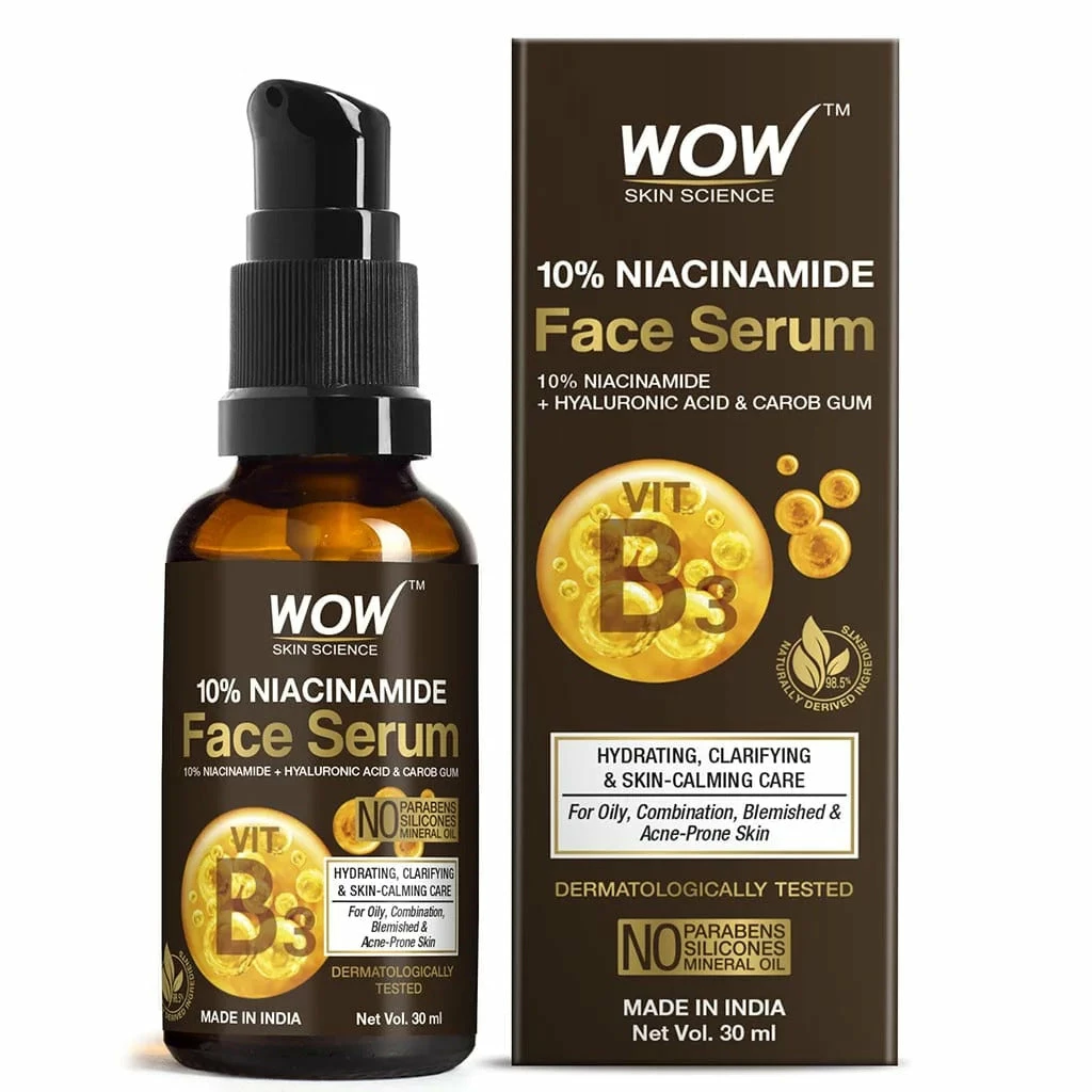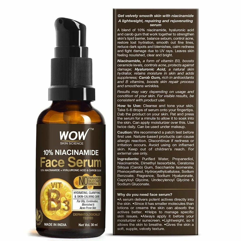 Niacinamide 10% serum is formulated to balance your breakout-prone, greasy, and dehydrated. It delivers the goodness of 10% niacinamide, hyaluronic acid, and carob gum. It is a lightweight, repairing, and rejuvenating face serum that is ideal for oily, combination, blemished, and acne-prone skin. It is made with 98.5 naturally derived ingredients. WOW Skin Science Niacinamide 10% Face Serum contains no silicones, mineral oil, or parabens and is made in the beautiful valley of The Himalayas.