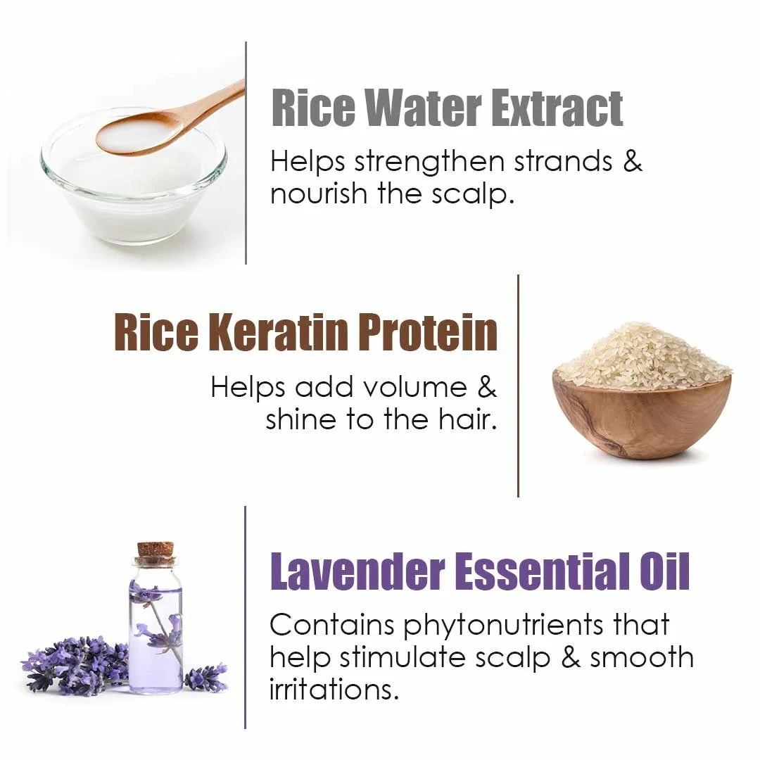 Our rice hair mask has essential minerals and vitamins in rice water that protect hair from damage and stimulate weak roots.