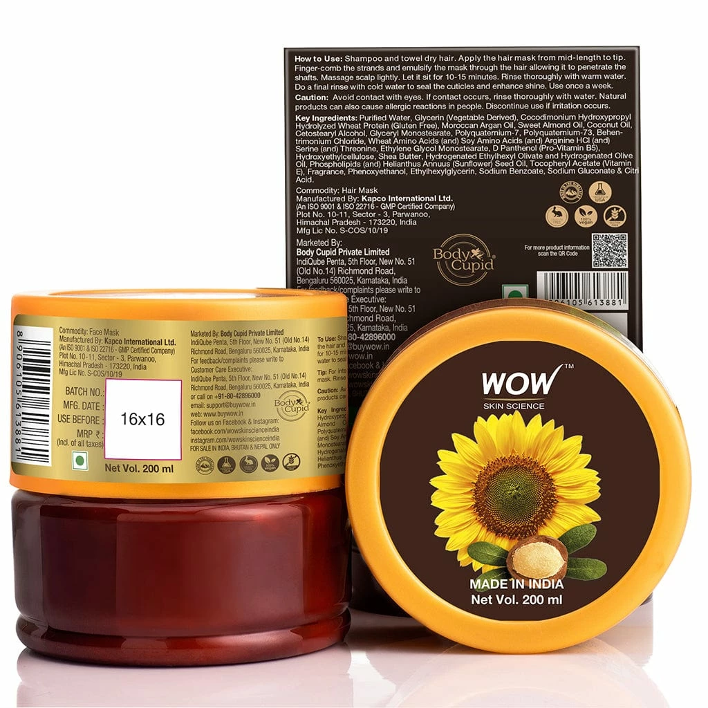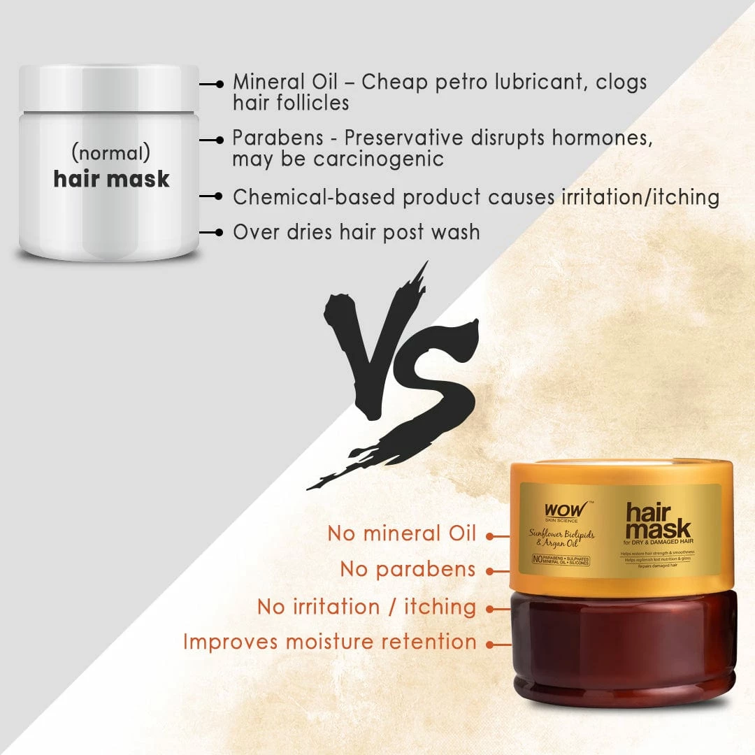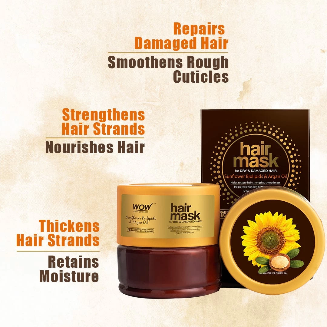 WOW Skin Science Hair Mask for Dry & Damaged Hair breathes new lease of life into hair harmed by dyes, heat/ chemical styling, ultraviolet sun rays, and rough handling. Its healing and reviving formulation contains Sunflower Biolipids, Hydrolyzed Wheat Protein & Argan Oil – each bioactive proven to be a boon for hair. Sunflower biolipids being similar to hair fibers enter damaged hair shafts to help repair, seal and strengthen each strand. Hydrolyzed Wheat Proteins thicken hair strands and shield from further damage. Argan oil being rich in Omega 6 Fatty Acids and Vitamin E gives deep nourishment to the scalp and hair. With regular use of this Hair Mask, your hair frizzes less, tangles less and combs more easily. Your tresses look smoother, silkier and stronger.