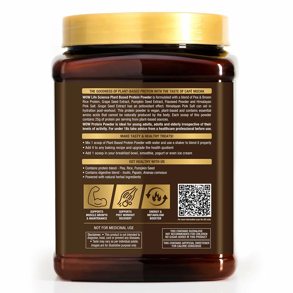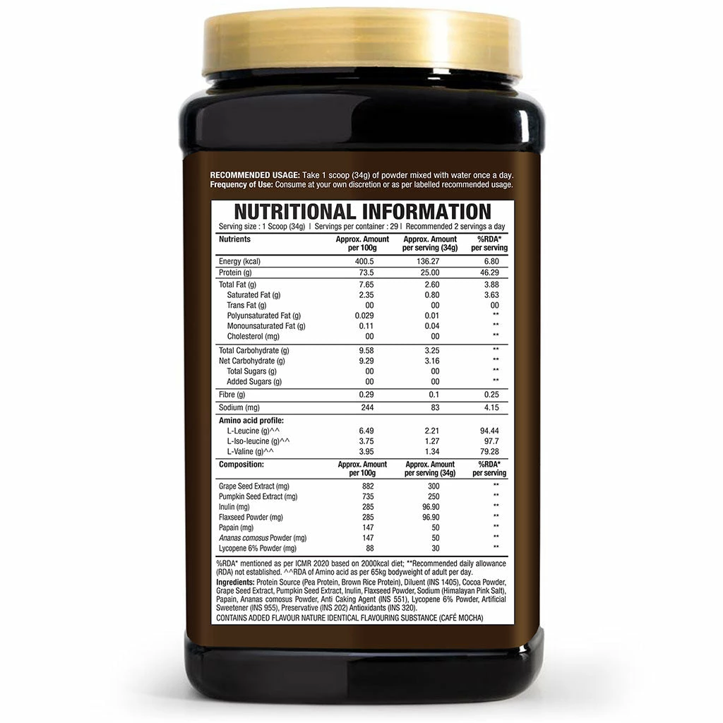 Our plant-based protein powder is formulated with a blend of Pea & Brown Rice Protein + Grape Seed Extract + Pumpkin Seed Extract + Flaxseed Powder + Himalayan Pink Salt. Grape Seed Extract has an antioxidant effect. Himalayan Pink Salt can aid in hydration post-workout. Our vegan protein powder is vegan, plant-based, and contains essential amino acids that cannot be naturally produced by the body. Our plant-based protein powder that is cholesterol-free and sugar-free helps in easy digestion. Each scoop of this powder contains 25g of protein per serving from plant-based sources. Our vegan protein powder is ideal for young adults, adults, and the elderly irrespective of their levels of activity. For those under 18s, take advice from a healthcare professional before use. It comes in this delicious Cafรฉ Mocha flavor to give you the taste of your favorite coffee as you consume your daily protein intake.